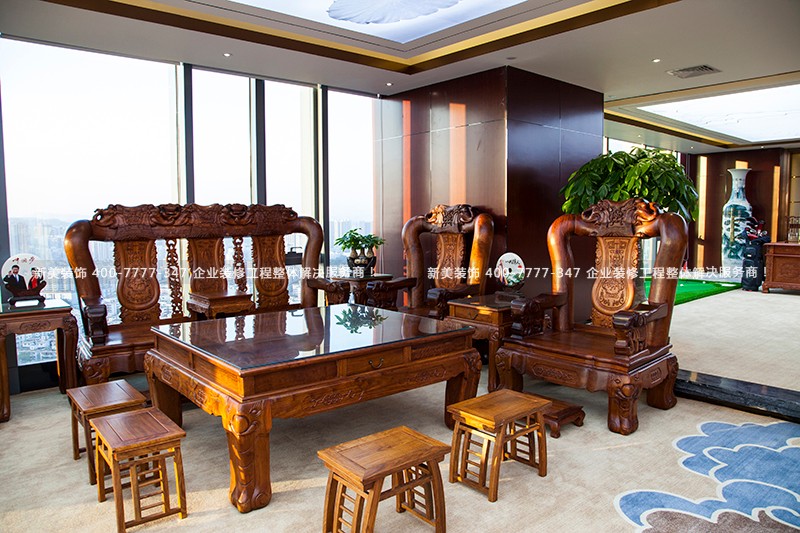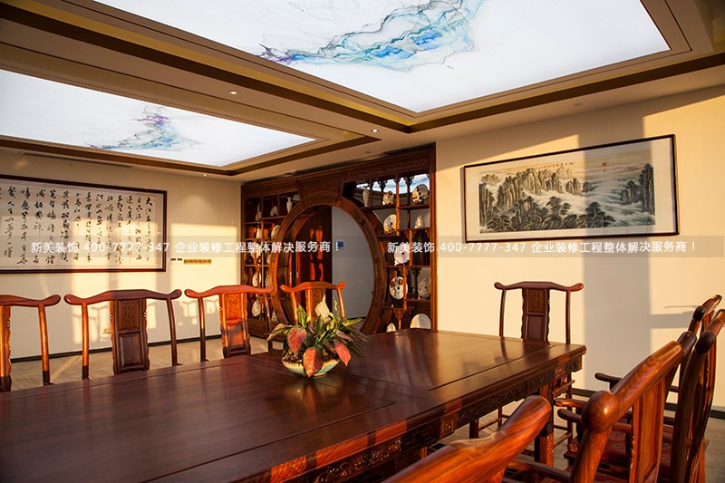 董事長辦公室使用了大量的實木家具,明靜空靈,入內讓人感受到無比的莊嚴而靜謐大包間,空間寬闊,傳統的裝飾造型,與色彩搭配互為融入,讓整個包間莊重而富有溫馨感。
